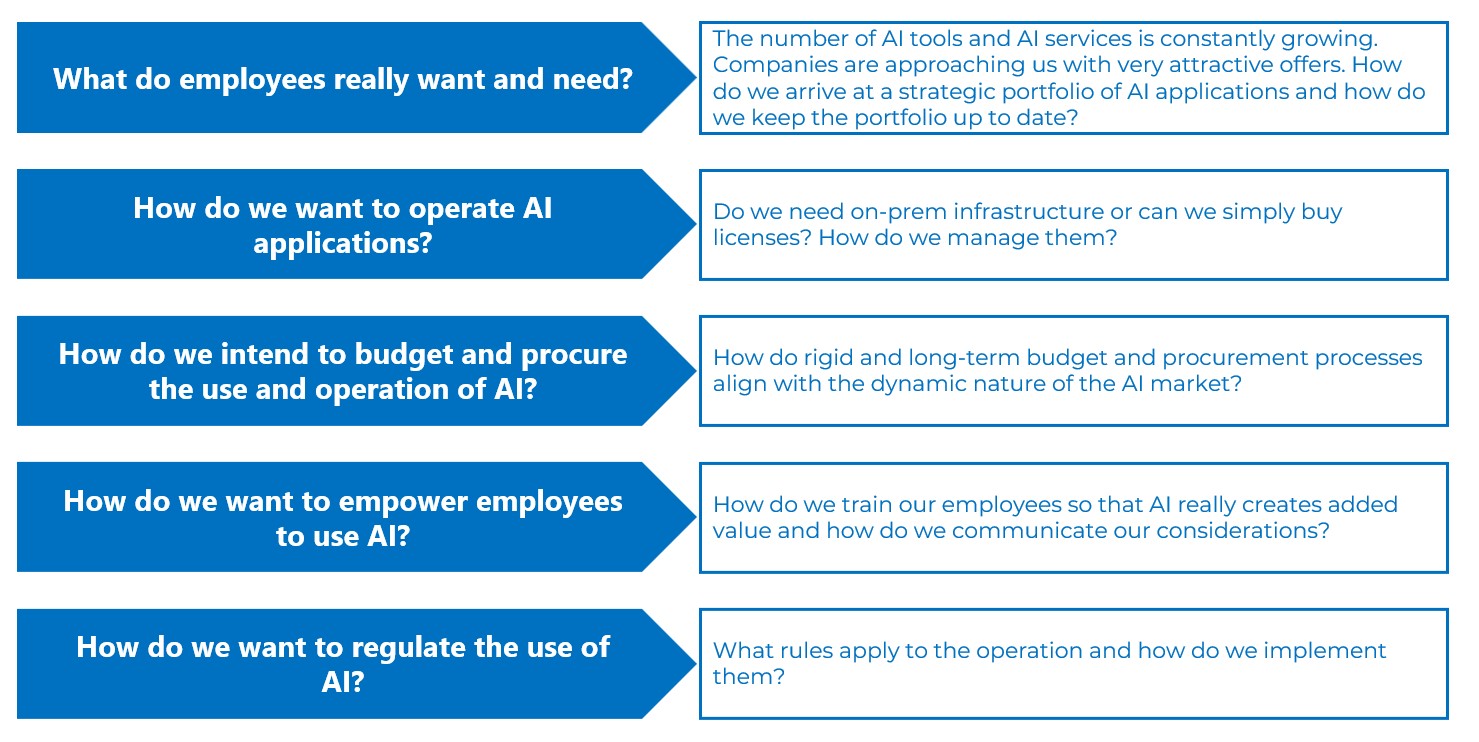 This challenge is exacerbated by the extraordinarily dynamic development of the AI landscape. New models, services and providers are emerging at a pace that overwhelms traditional IT governance processes. At the same time, this puts even more pressure on IT budgets, while the scope for investment remains limited. The following challenges arise in particular in the conflict between innovation, risk and costs: